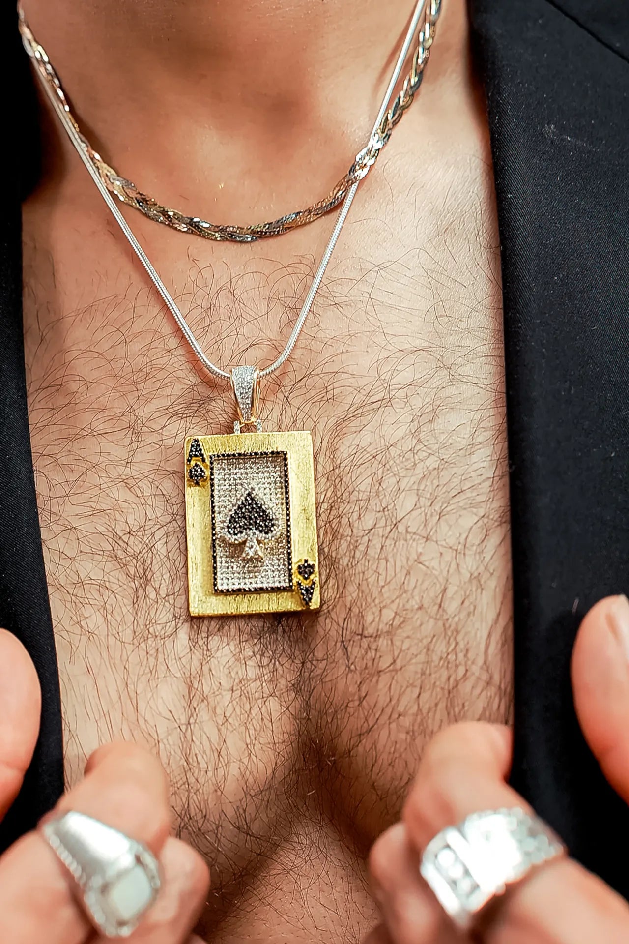 Play your cards right. The Ace of Spades Silver Pendant is for those who bet on themselves — always. With jet-black and crystal-white stones set in a gold frame, it's the kingmaker’s charm.