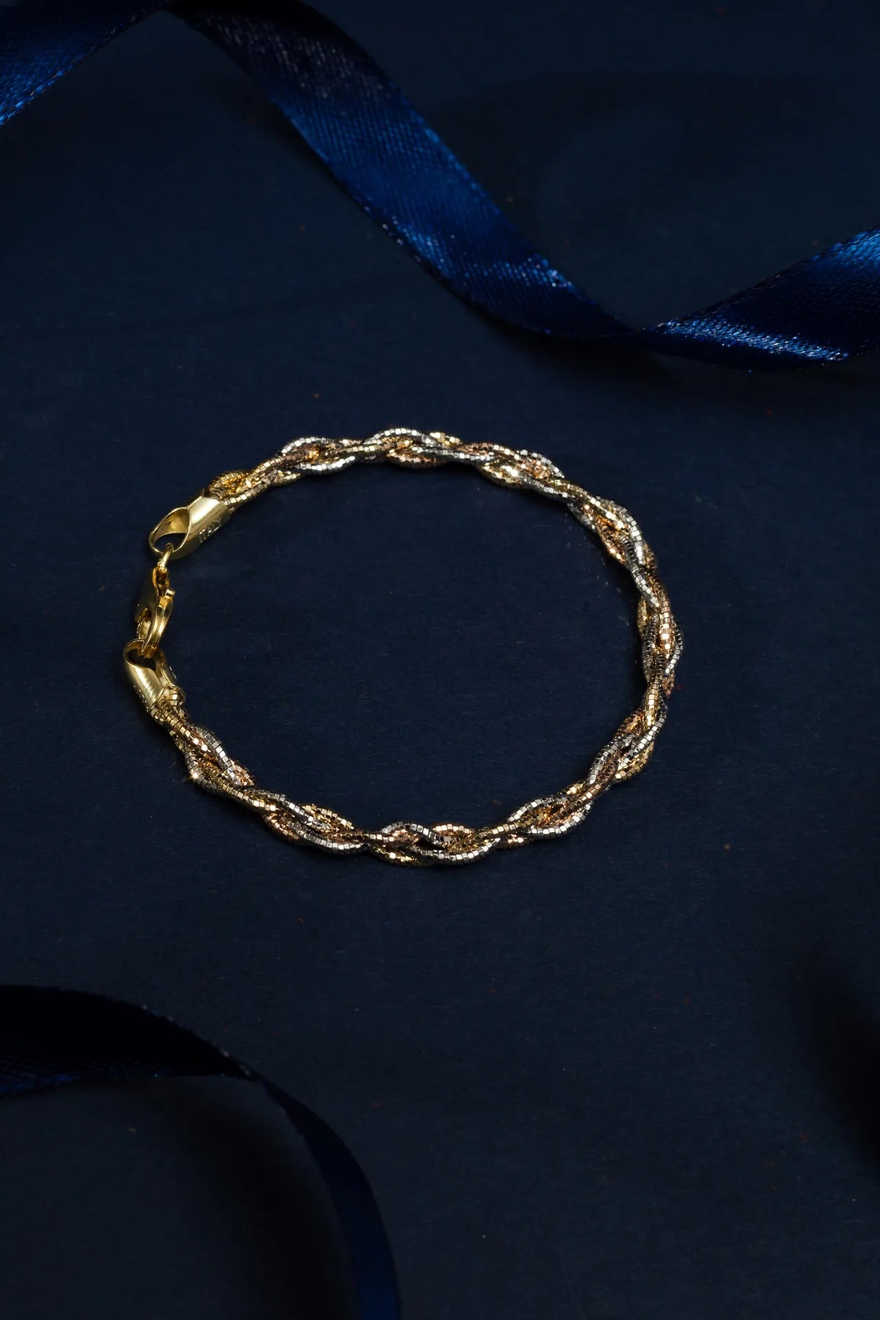 The Evyn Rose Gold Bracelet features an intricate twisted design, where delicate strands of rose gold-plated silver, yellow gold-plated silver and silver intertwine in a mesmerizing pattern.