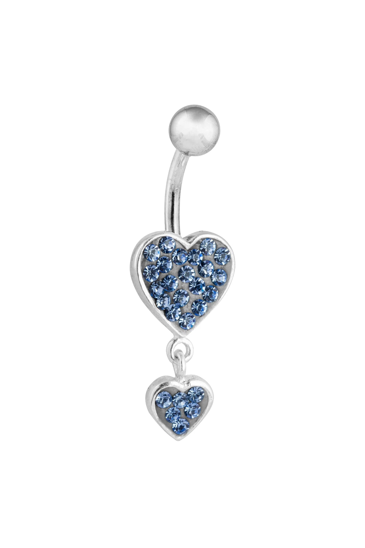 Carefully fashioned from high-quality 92.5 sterling silver, the Gaia Belly Button Ring is a mesmerising creation. It boasts two heart-shaped pendants, each adorned with a collection of captivating blue cubic zirconia stones.