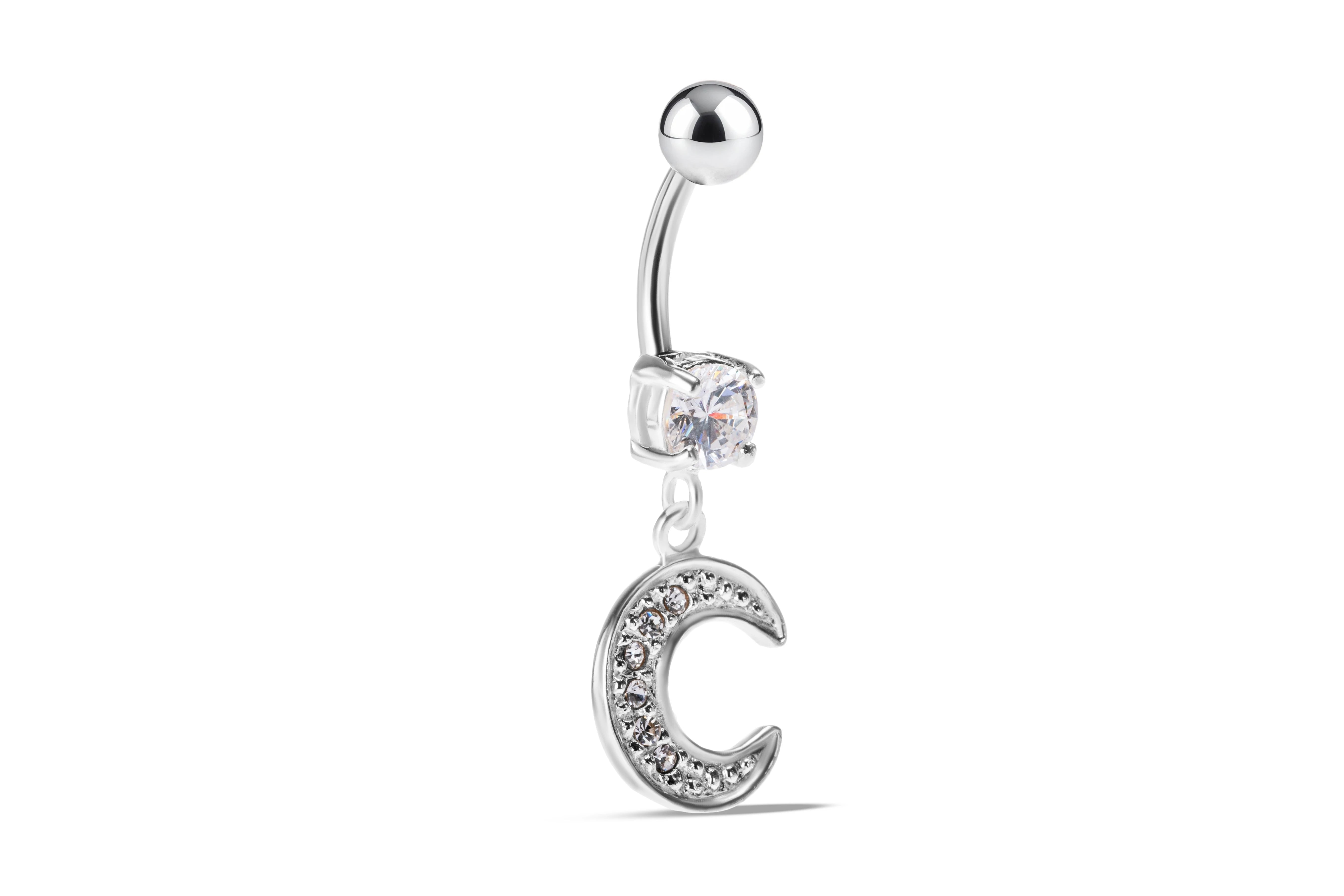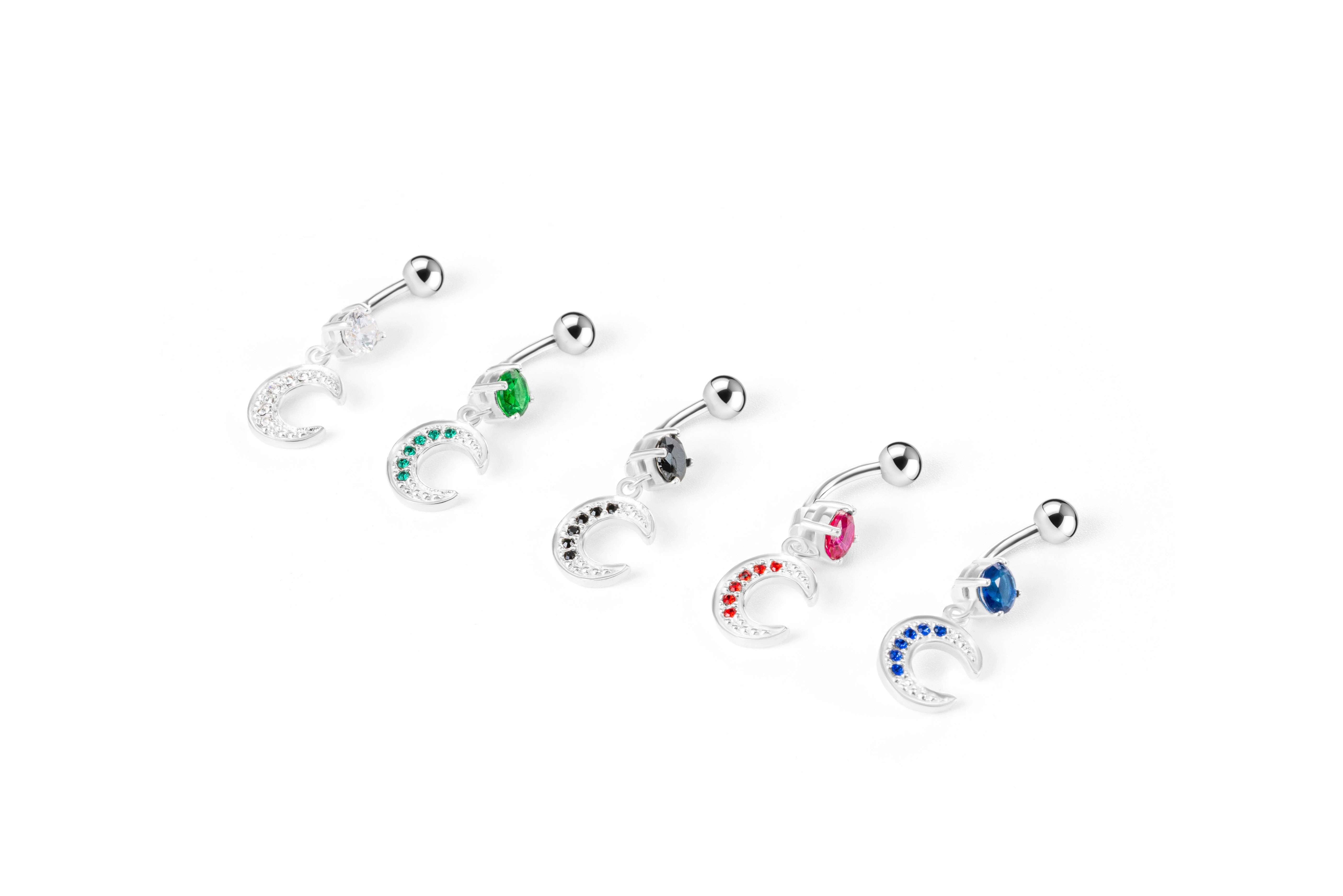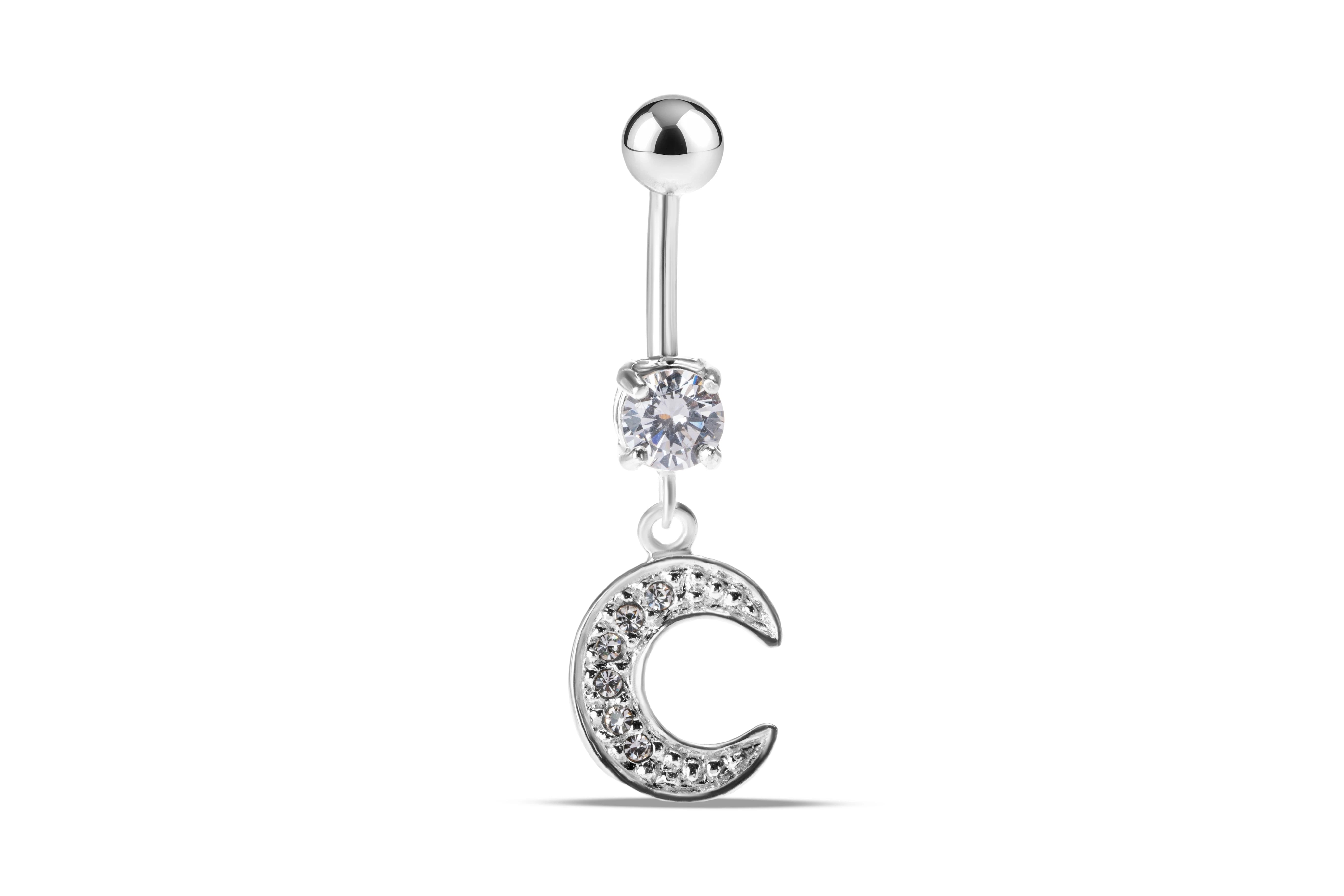 The Lunara Belly Button Ring is shaped around a crescent moon form, accented with fine zirconia detailing that follows its curve. The open design keeps the piece light and fluid, while the subtle stone placement adds dimension and quiet sparkle.