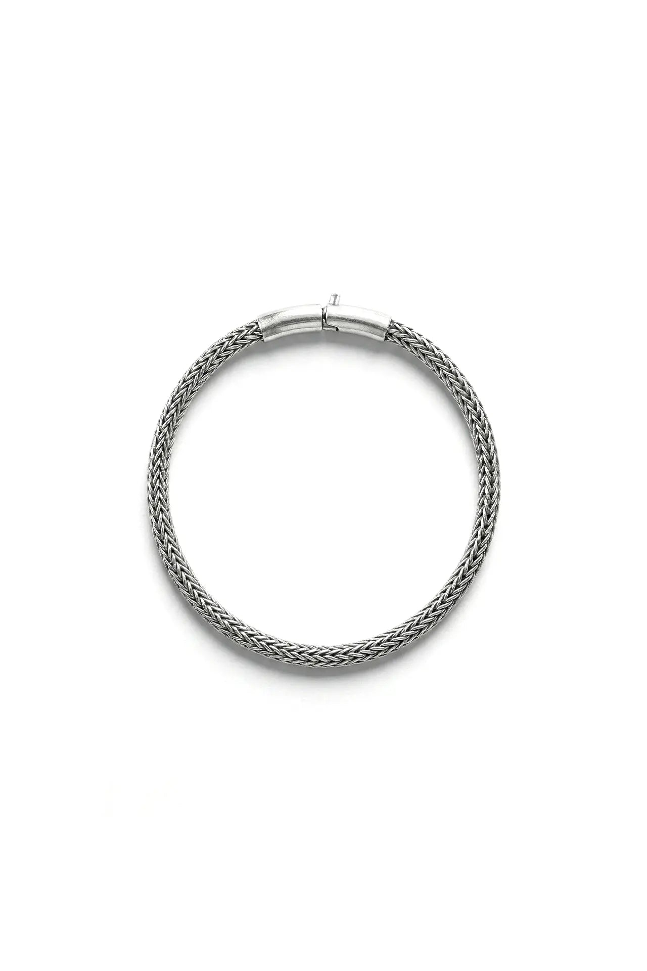 This bracelet features a meticulously braided design, where each strand of silver is intricately woven to create a harmonious and flexible pattern.