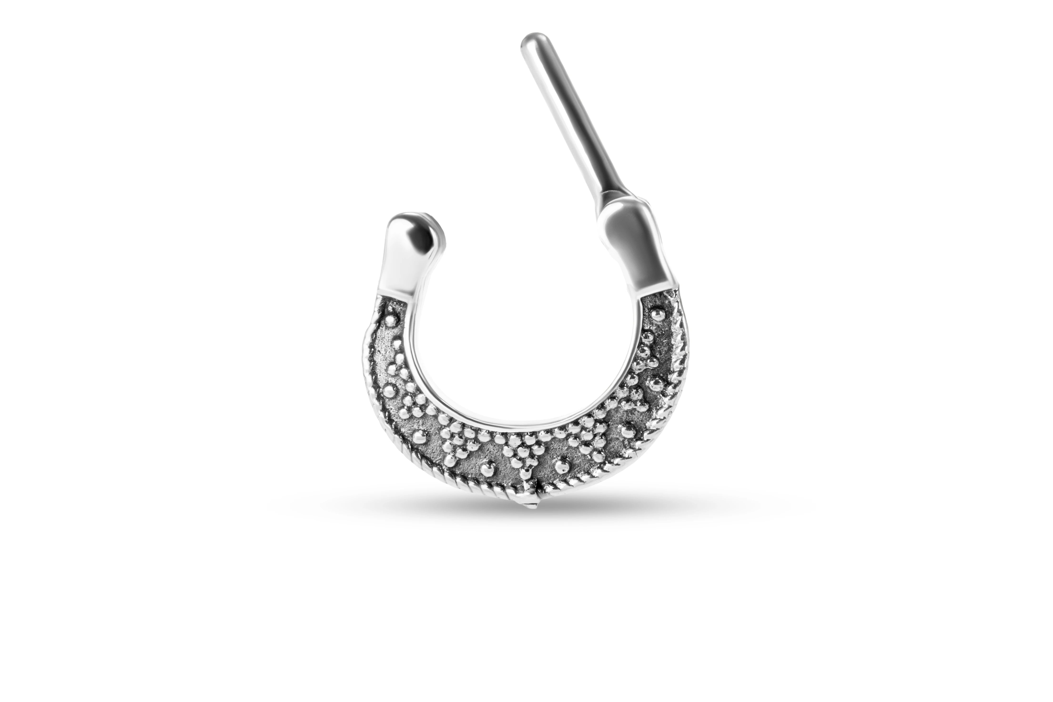The Mitra Silver Septum Ring features a softly contoured, crescent-like form enriched with a dense pattern of micro zirconia detailing across its surface. The stones are set close together, creating a textured, almost pavé-like finish that adds depth without overwhelming the design.