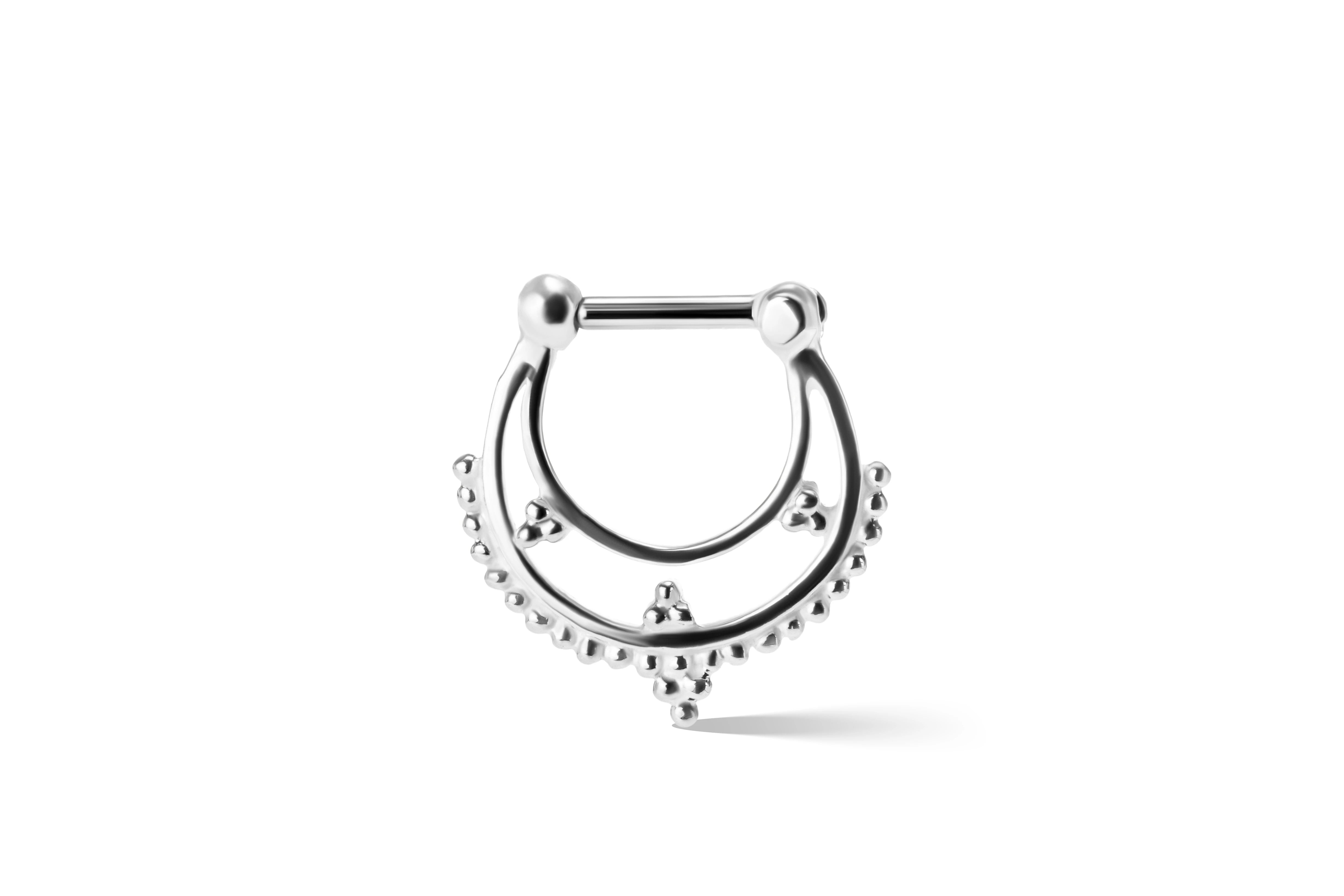 The Mivera Silver Septum Ring features a layered crescent form, defined by two parallel arcs that create depth and quiet movement. The lower arc is detailed with a fine row of polished bead accents, forming a delicate fringe that adds texture without overwhelming the design.