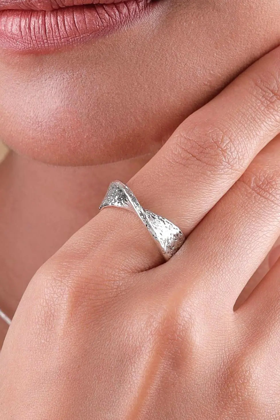 Unveil the raw beauty of nature with the Primal Twist Sterling Silver Ring. This unique piece features a captivating twisted design, crafted from 92.5% pure sterling silver, and is enhanced with natural textures and indentations.