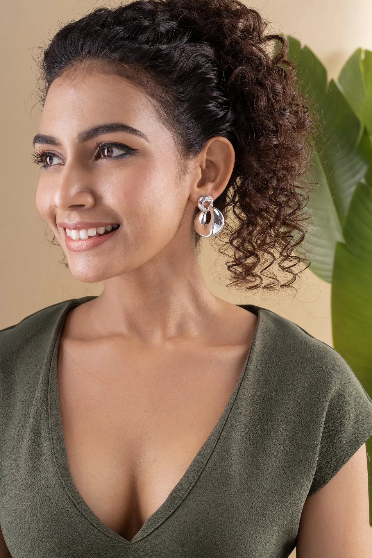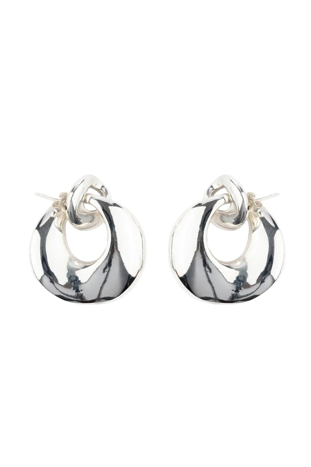 Elevate your look with the Ramona Shine Silver Earrings, featuring a polished, chunky C-shape hoop interlocking with a smaller circle at the earlobe.