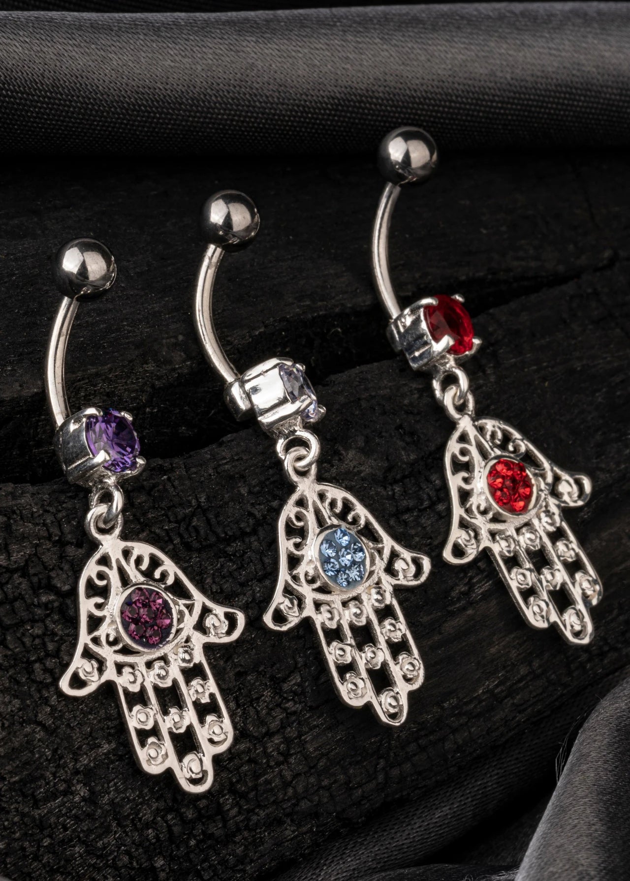 The Sacred Glow belly ring merges tradition and elegance with its intricately crafted Hamsa hand charm.