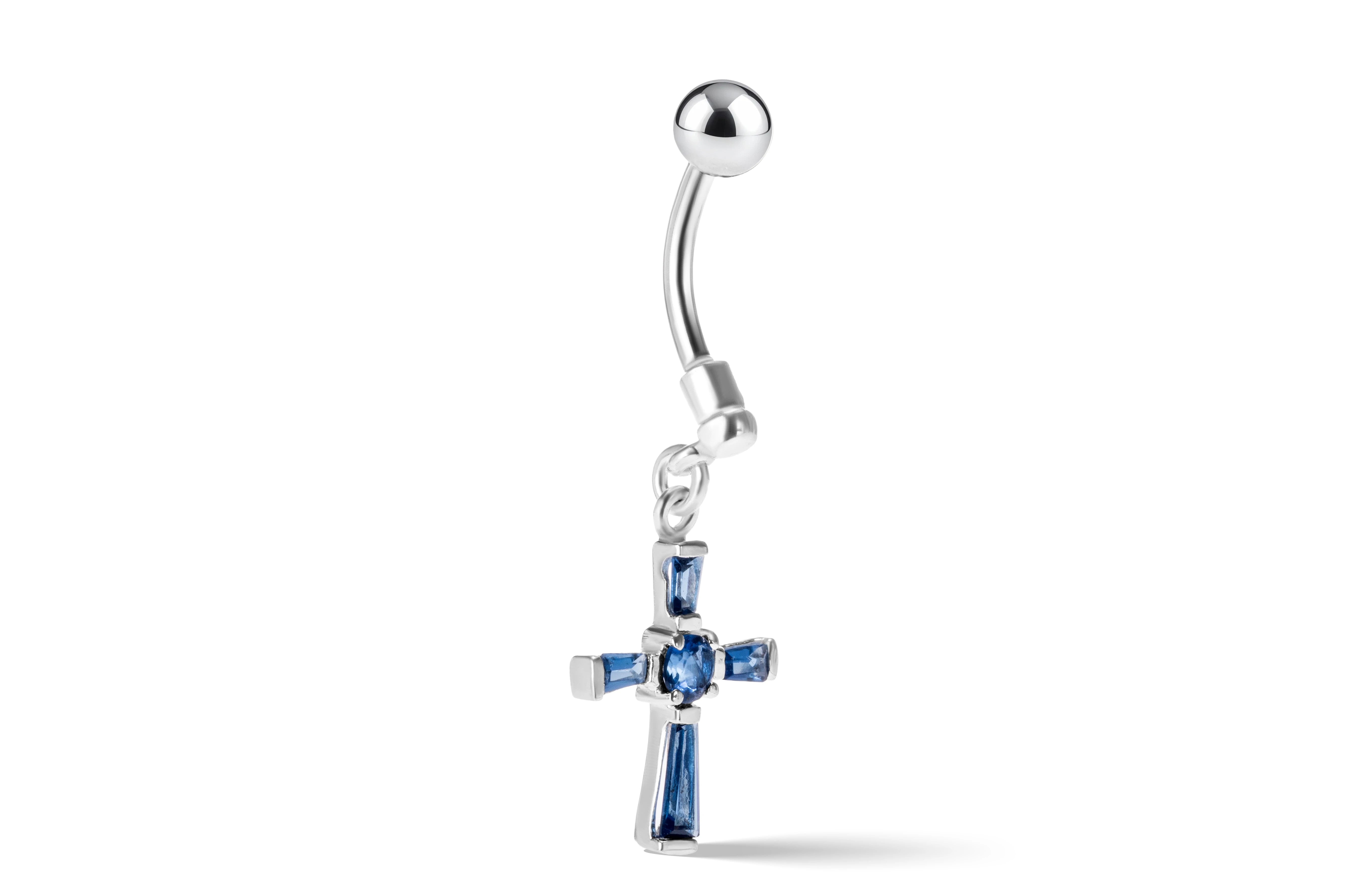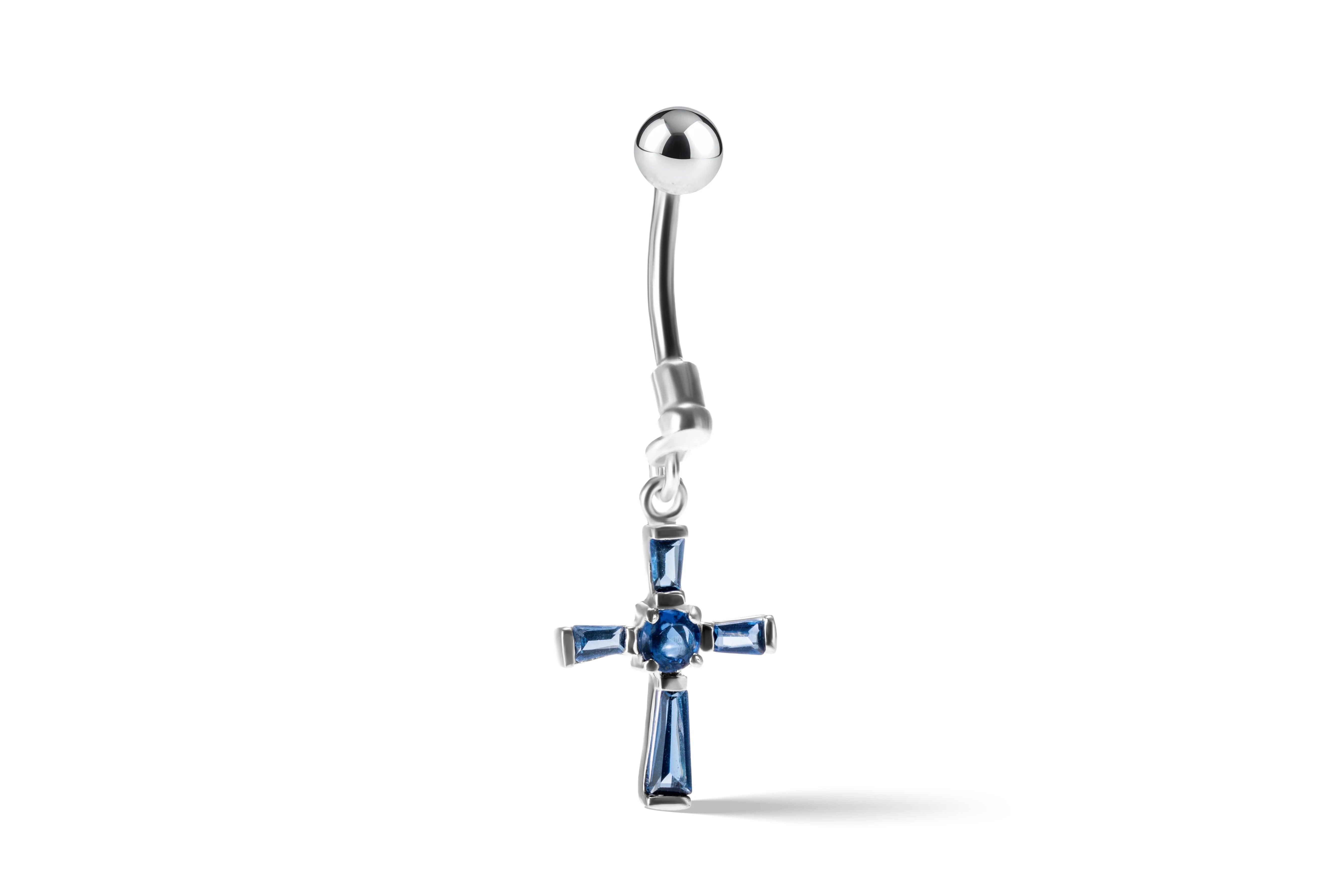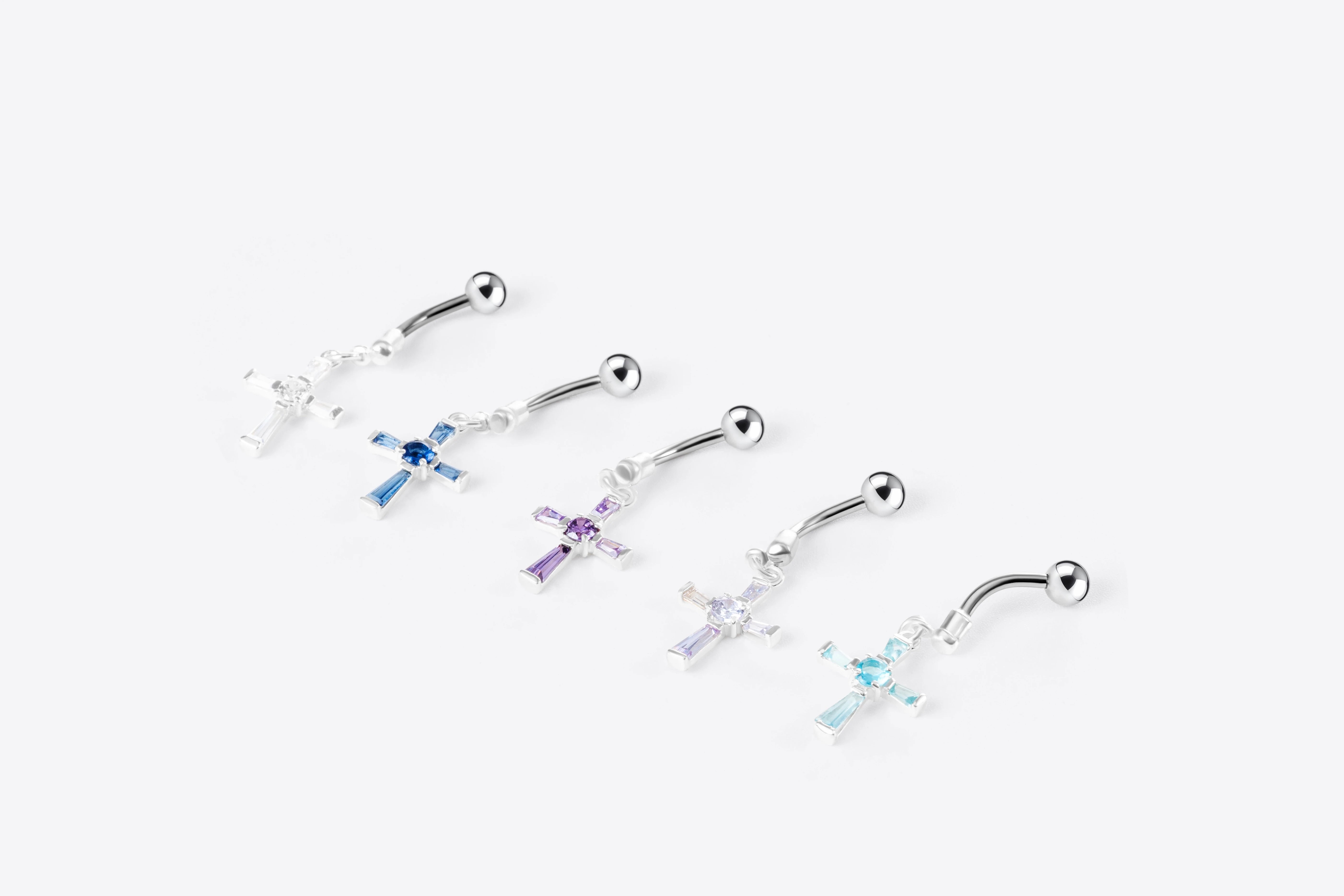 The Sancta Belly Button Ringcentres around a refined cross motif, built with sharp symmetry and softened by zirconia accents. Its linear design creates a sense of balance and intention, allowing the form to feel symbolic without being overpowering.